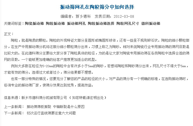 我公司于2012年3月8日發(fā)表了《振動(dòng)篩網(wǎng)孔在陶粒篩分中如何選擇》的一篇新聞。如下圖: